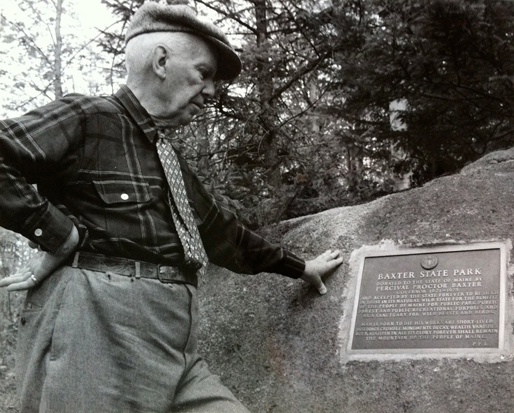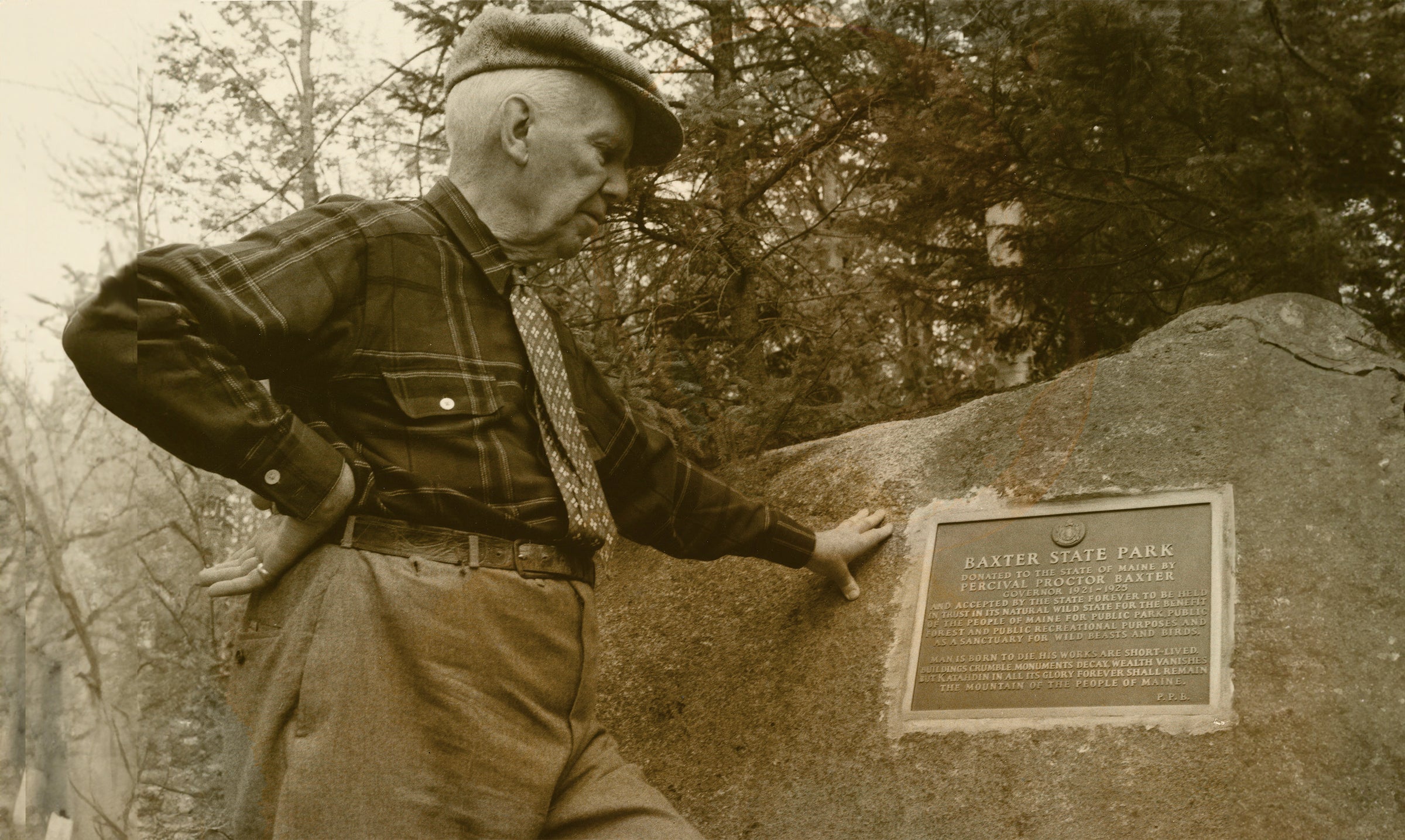 Governor Baxter inspects the plaque commemorating his gift of Mount Katahdin and Baxter State Park to the state of Maine.