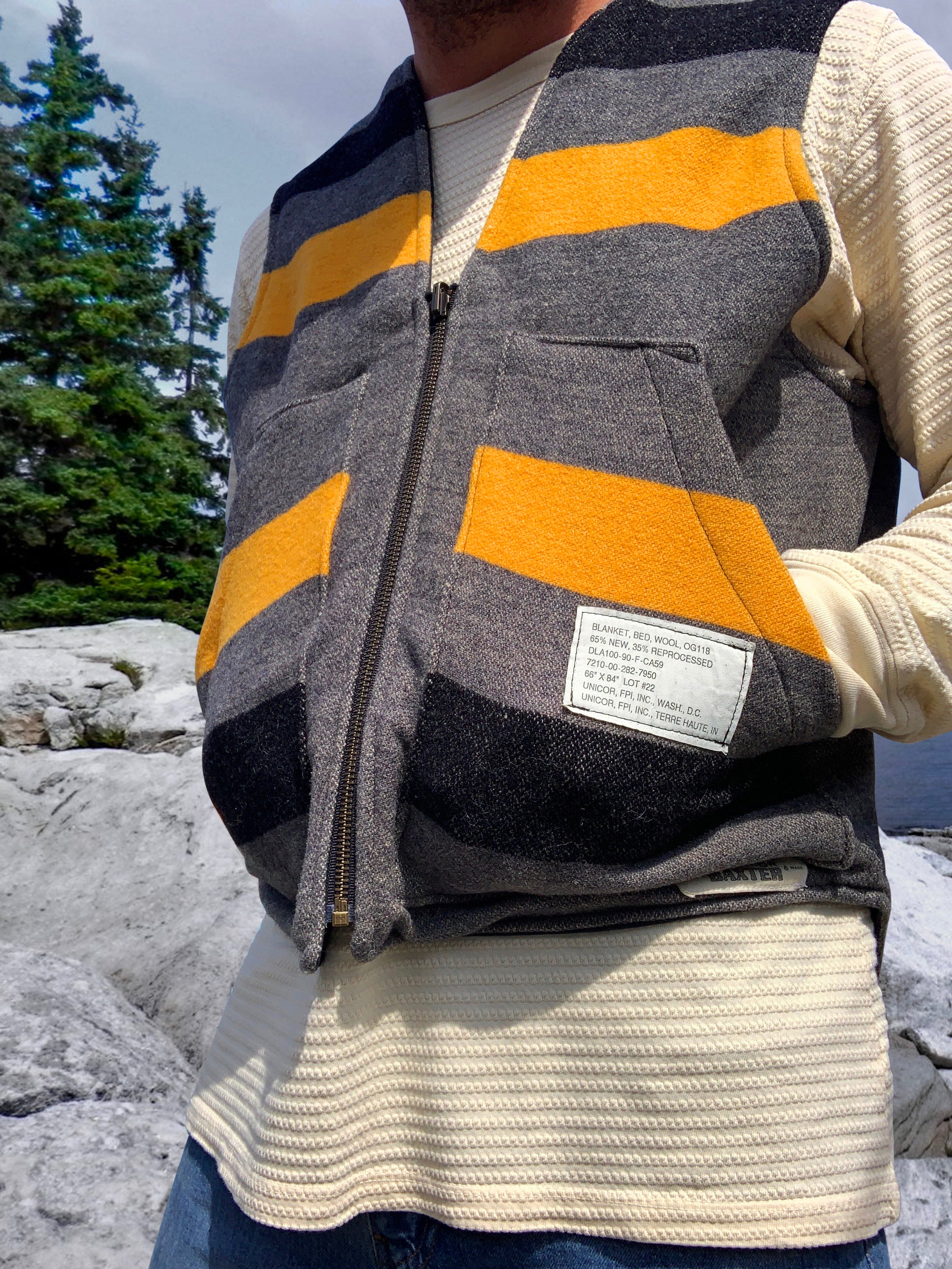 We make our products with natural materials sourced in America. For instance, many of our items are crafted with authetic recycled US military-grade wool. These blankets made it through WWII. Virgin wool woven in the US during the 1940’s in brick mills to arcane specs. We think they deserve respect and a new home. Try our Custom Military Blanket Vest—you pick the war, you pick the service.
